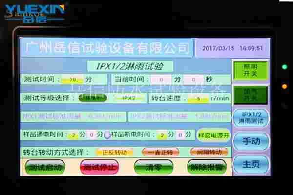 岳信IPX2滴雨试验设备企业用于测试产品的IPX1、IPX2防水等级,测试样品包含电子元件、户外灯具、手机外壳、汽车配件等,采用箱式结构,无场地限制,内箱水循环使用,7寸触摸屏,全新操作系统,更能远程操作,方便快捷。