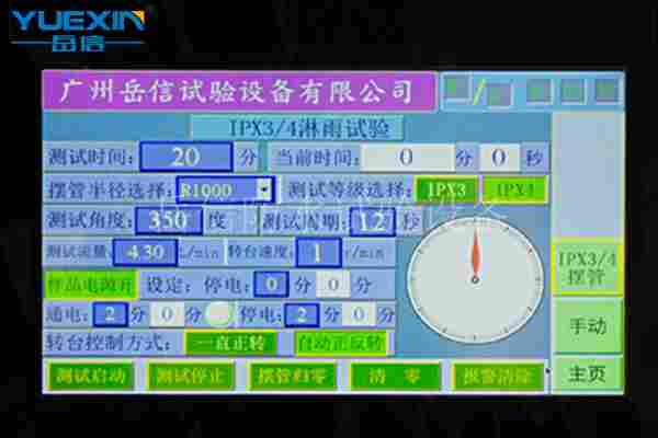 IPX34淋水测试设备厂家用于测试产品的IPX3、IPX4防水等级,测试样品包含电子元件、户外灯具、手机外壳、汽车配件等,采用分体式结构,适用比较大的样品,7寸触摸屏,全新操作系统,更能远程操作,方便快捷。